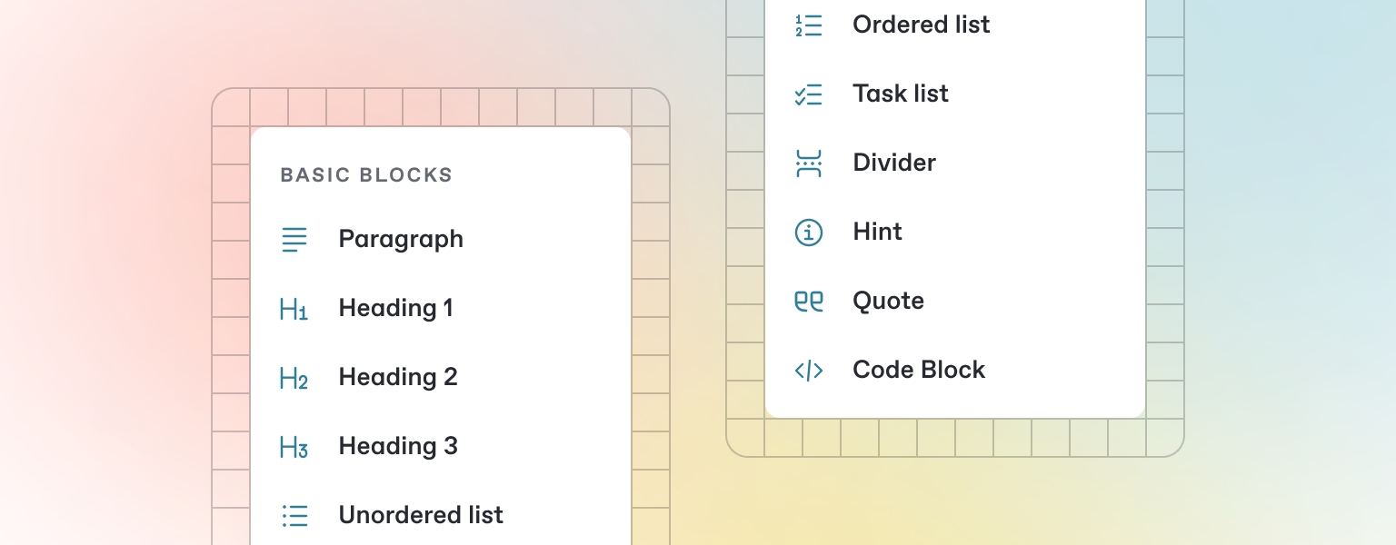 GitBook offers a range of block types for you to add to your content inline — from simple text and tables, to code blocks and more. These elements will make your pages more useful to readers, and offer extra information and context.